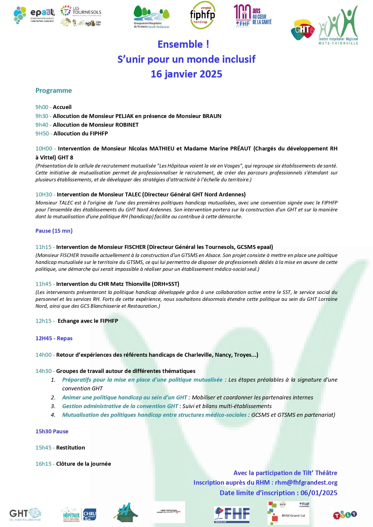 Le colloque du 16 janvier 2025 "Ensemble : s'unir pour un monde inclusif !" sera l'occasion d'explorer des solutions innovantes et de définir des stratégies communes pour renforcer l'inclusion et l'accessibilité dans les établissements de santé publics.